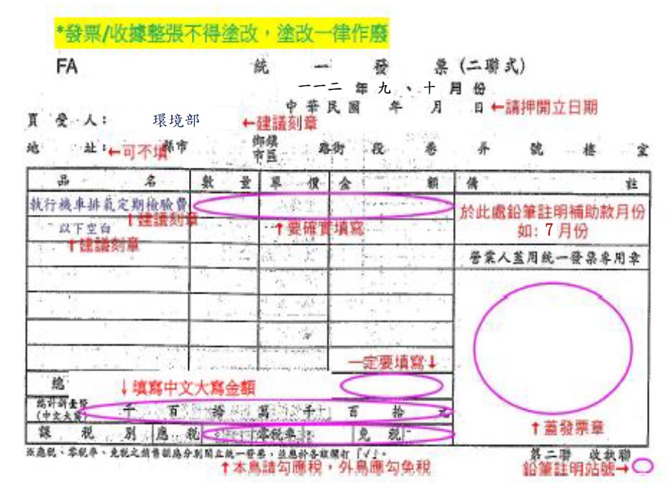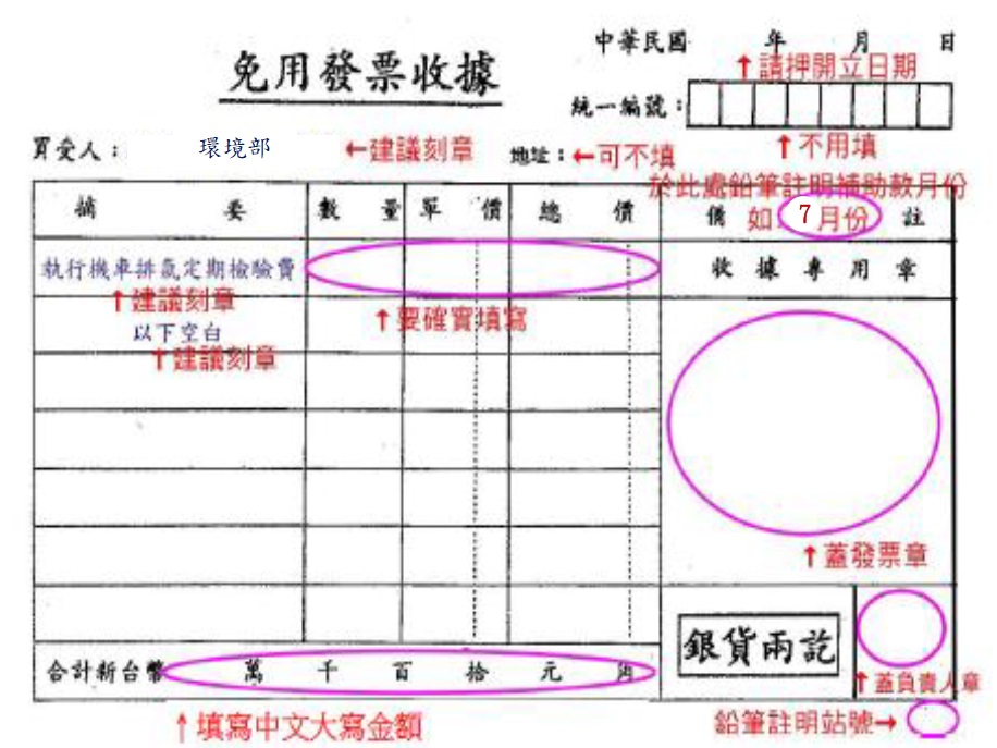 - 品名請填立"執行機車排氣定期檢驗費",下一欄位加註"以下空白"。